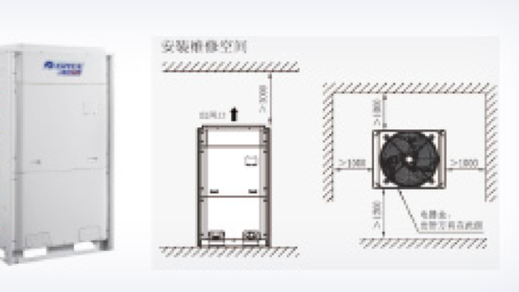 3.室外機是散熱設備,務必確保安裝位置通風流暢。以免影響使用效果。要求出風無障礙,如周圍空間為開放空間,機組頂部距頂墻1500mm以上;如非開放空間,或距頂墻不足1500mm,需接回風管。